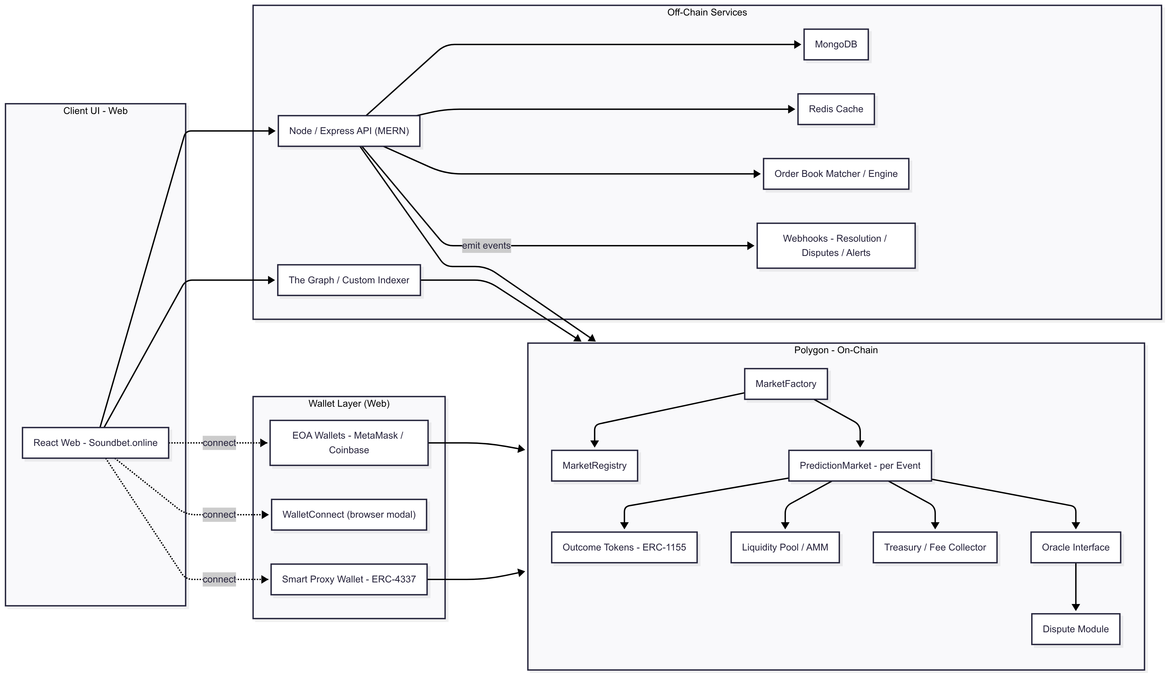 Role: Enforces the trustless core of the platform, ensuring trades, payouts, and resolutions happen transparently on the blockchain.