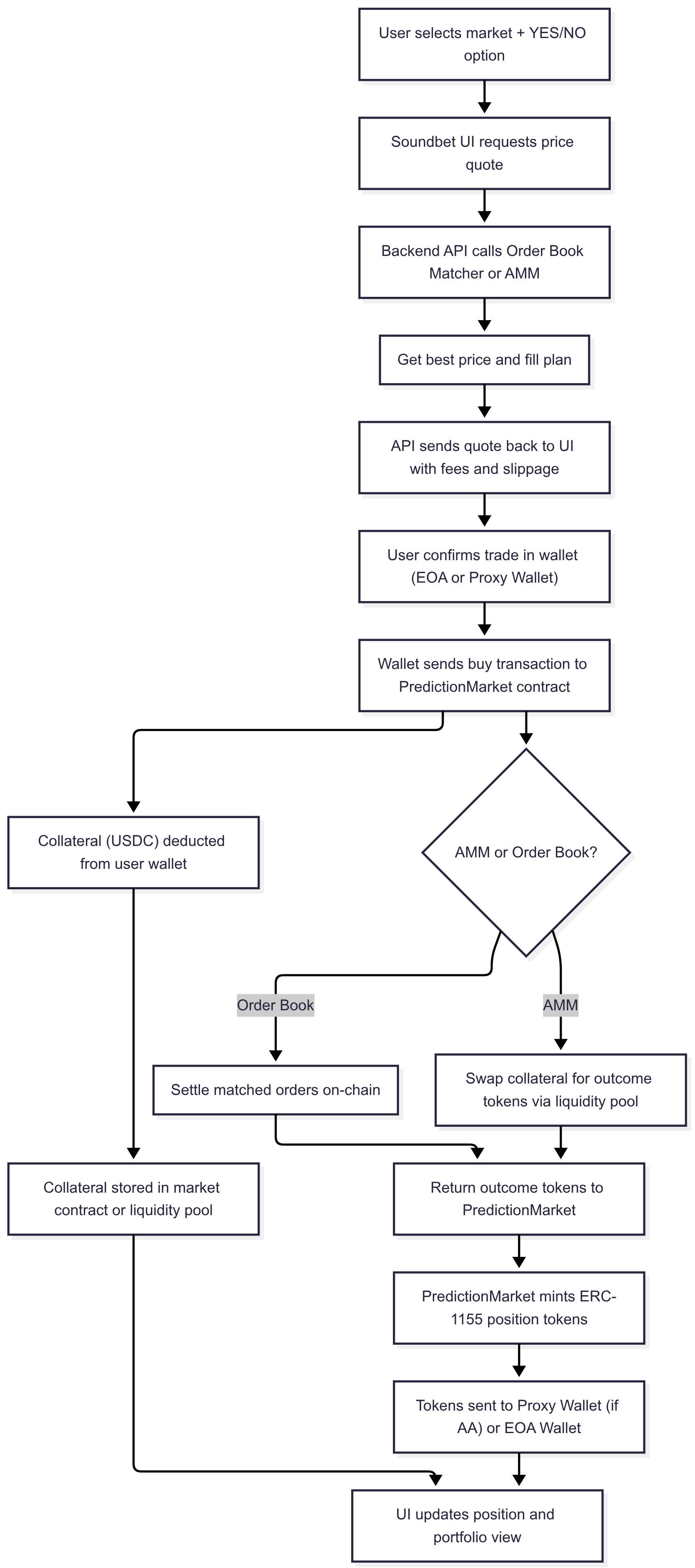 - Trade Settlement — Funds go from the user’s wallet directly into the market’s smart contract/liquidity pool.